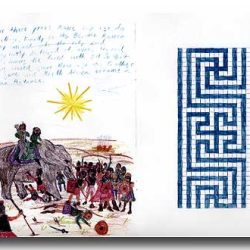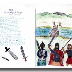 Top left is an excerpt from Macaulay’s poem Horatius Keeps the Bridge, illustrated on the right. Top right is Daniel’s illustration of Hannibal crossing the Alps, following the last paragraph of a short essay that we wrote about Hannibal. The mosaic pattern Daniel found too difficult to draw freehand, so we used graph paper.
